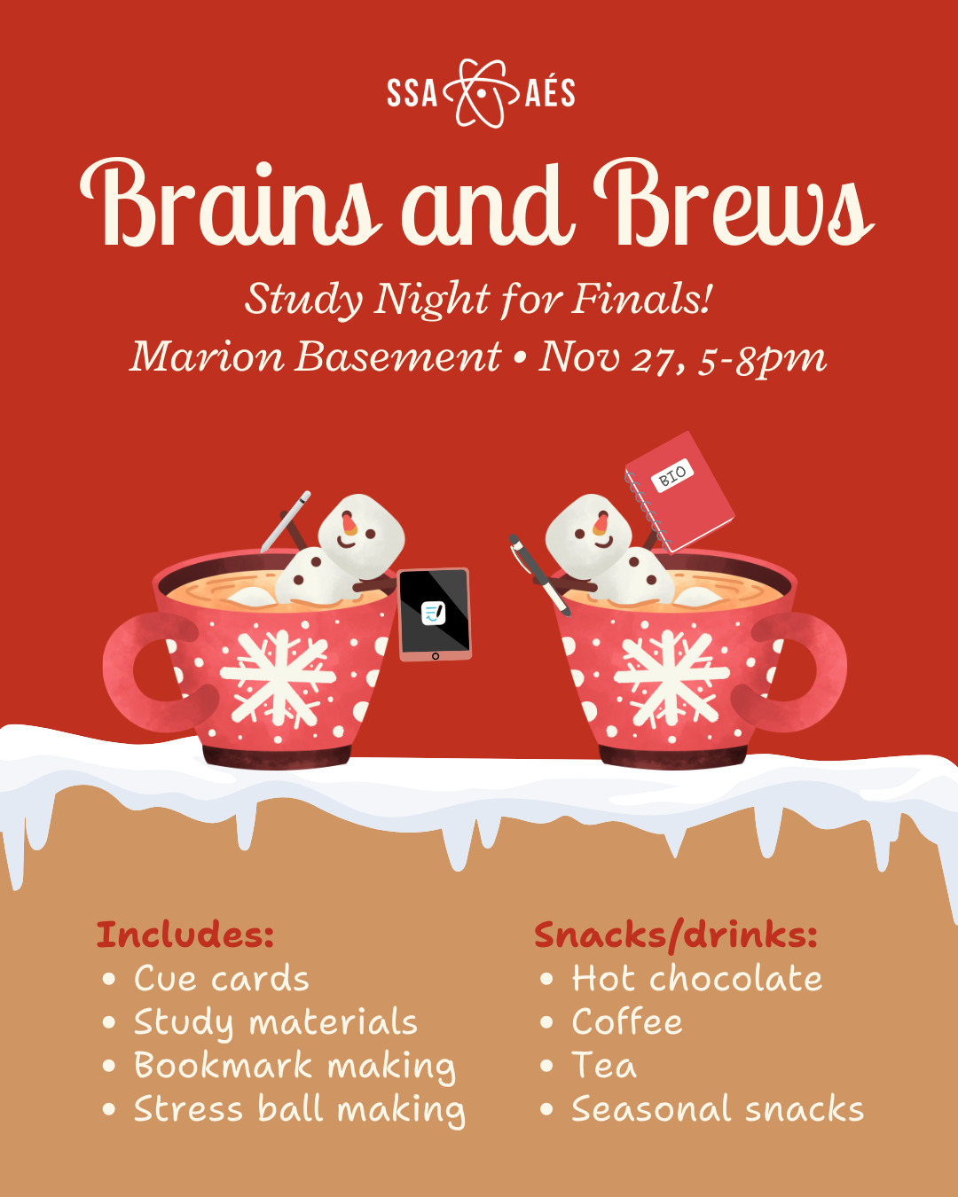 Gear up for exam season with a warm and welcoming study space for science students! Join us for a cozy study session featuring a hot chocolate, coffee, and tea bar, plus winter snacks to keep your energy up while you prep for finals. We will also have study materials and cue cards as well as stress ball and bookmark making to help you unwind!