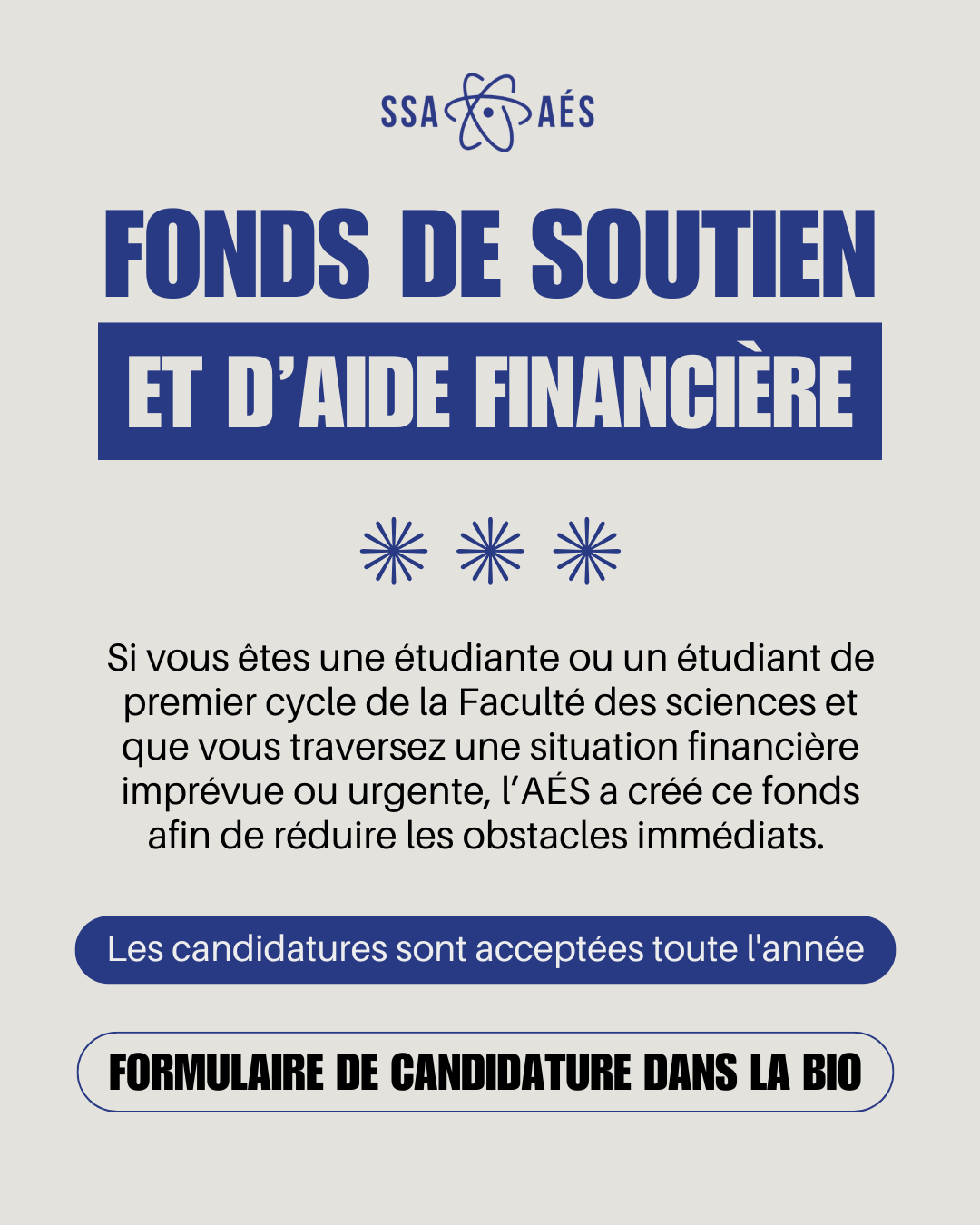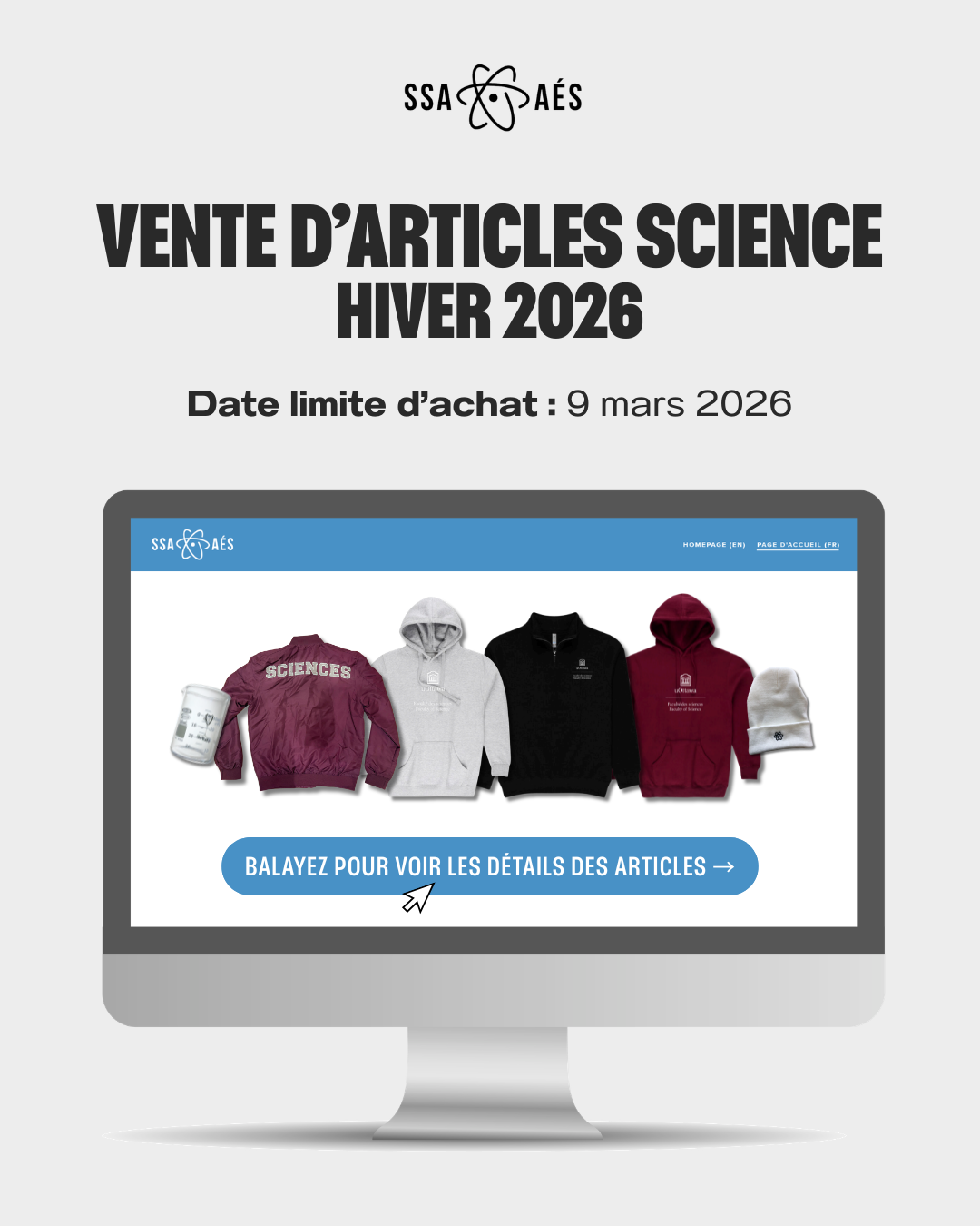 À PROPOS Notre Équipe 2025-2026Qui Nous SommesClubsFAQ RESSOURCES Ressources AcadémiquesBourses et SubventionsL'Équité et l'Accessibilité SERVICES Heures de BureauÉquipement de laboratoireVente des manuelsCasiersMarchandises ÉVÉNEMENTS Événements à venirÉvénements passés INFO AÉS ConstitutionBudgetRéunions + Procès-verbaux de RéunionsÉlections Bienvenue à l’Association des Étudiant.e.s en Sciences Événements actuels Fonds de subventions Boxing Without Borders Bal de promotion Vente d’articles 2026 Élections Fonds de soutien at d’aide financière Formulaire de rétroaction