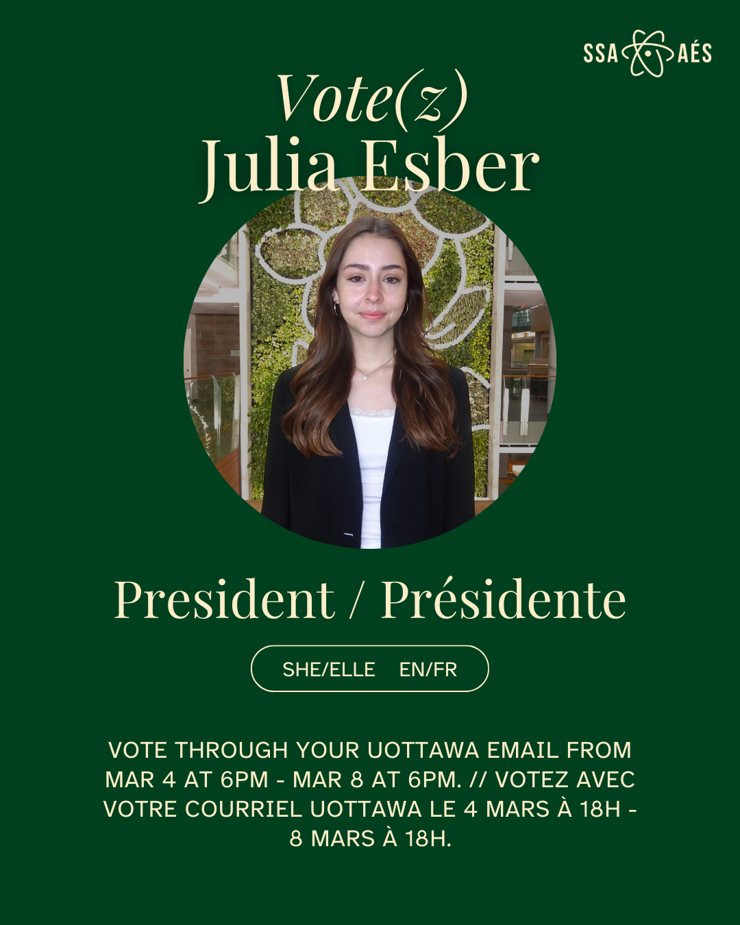 Je vous encourage à voter OUI pour moi en tant que prochaine présidente, car je suis très passionnée par l’AÉS et je sais que j'ai l'expérience, l'engagement et la compassion nécessaires pour la diriger. Si vous avez des questions, n'hésitez pas à me contacter sur Instagram @julia.esber.